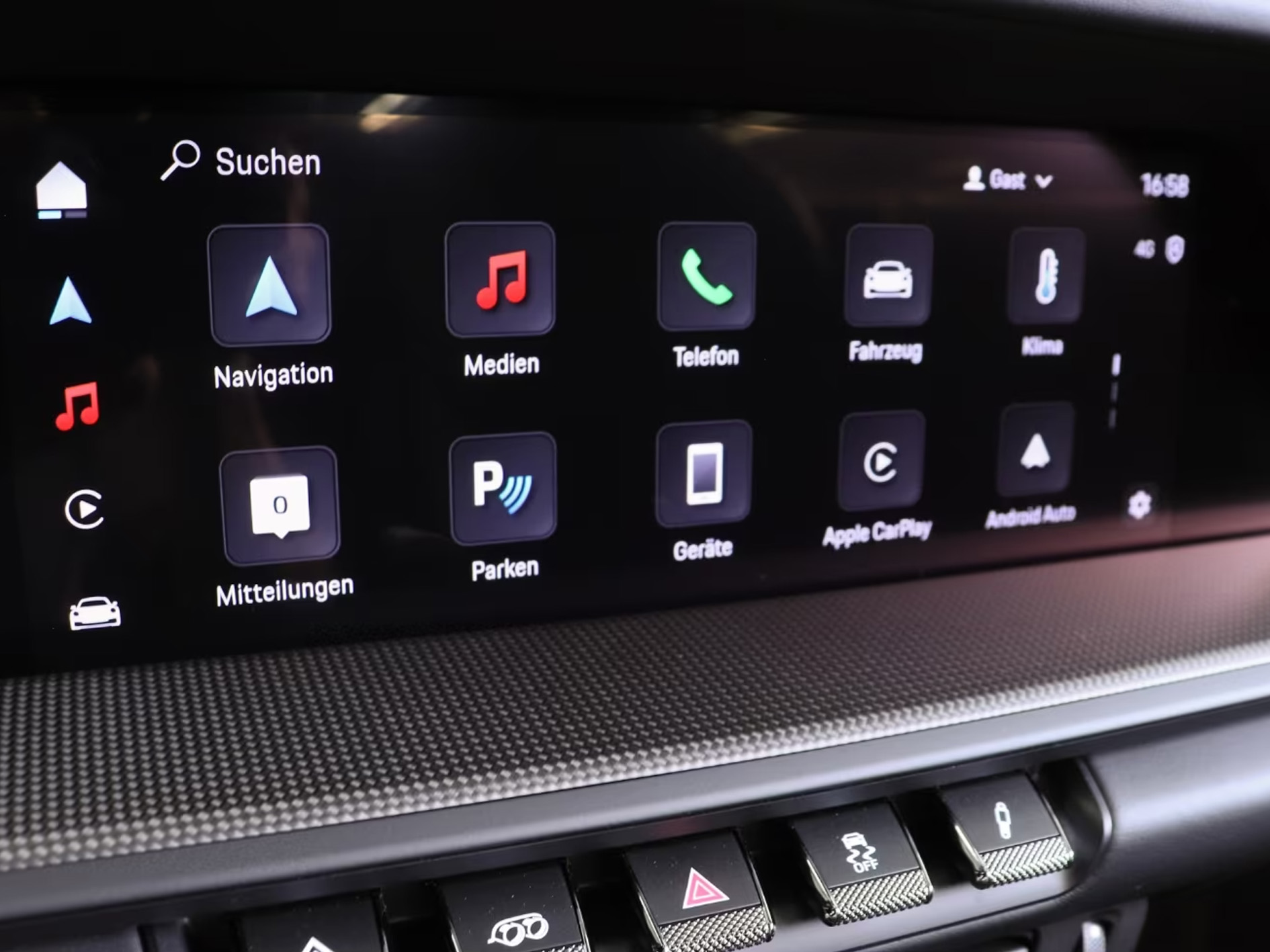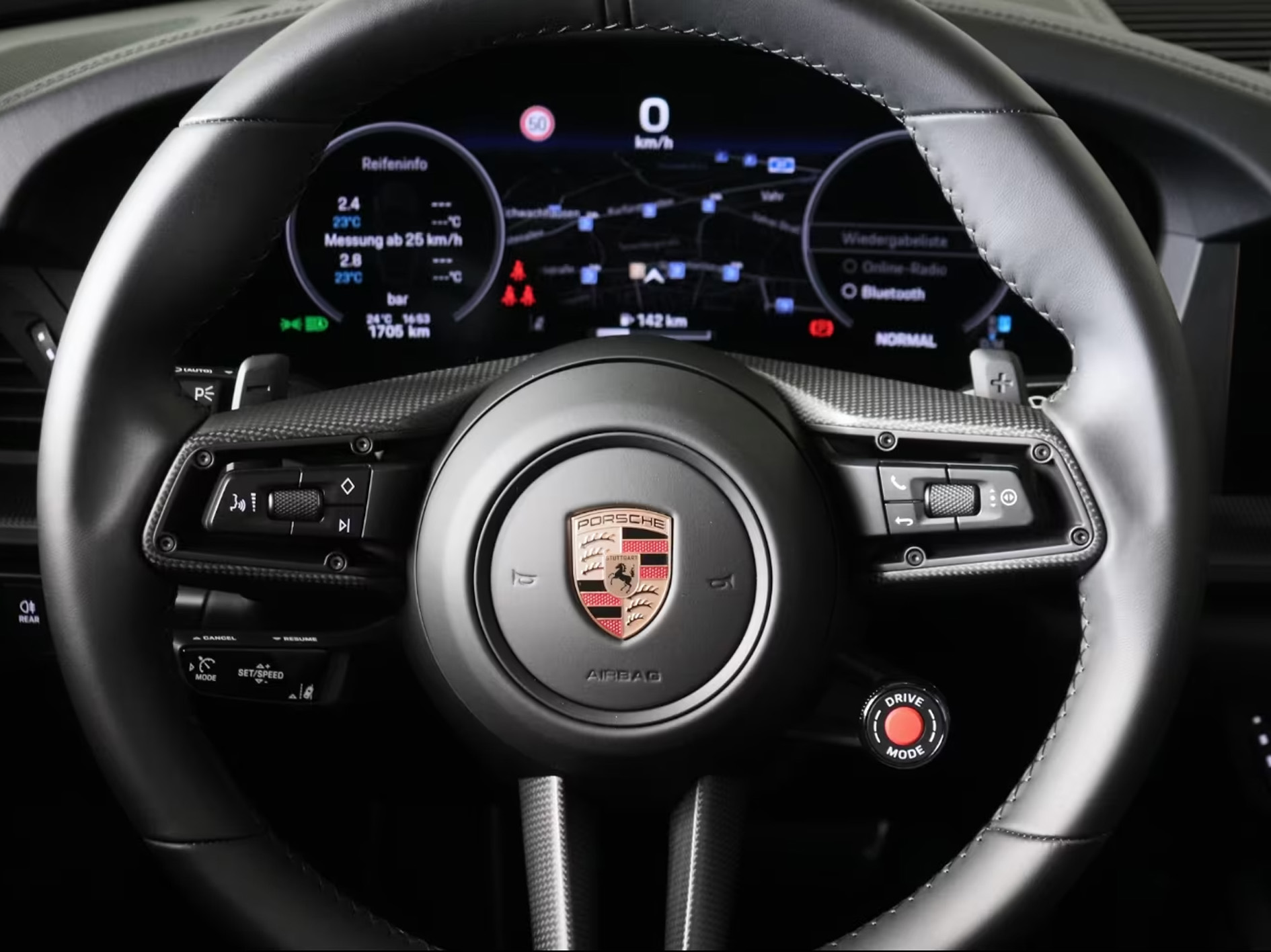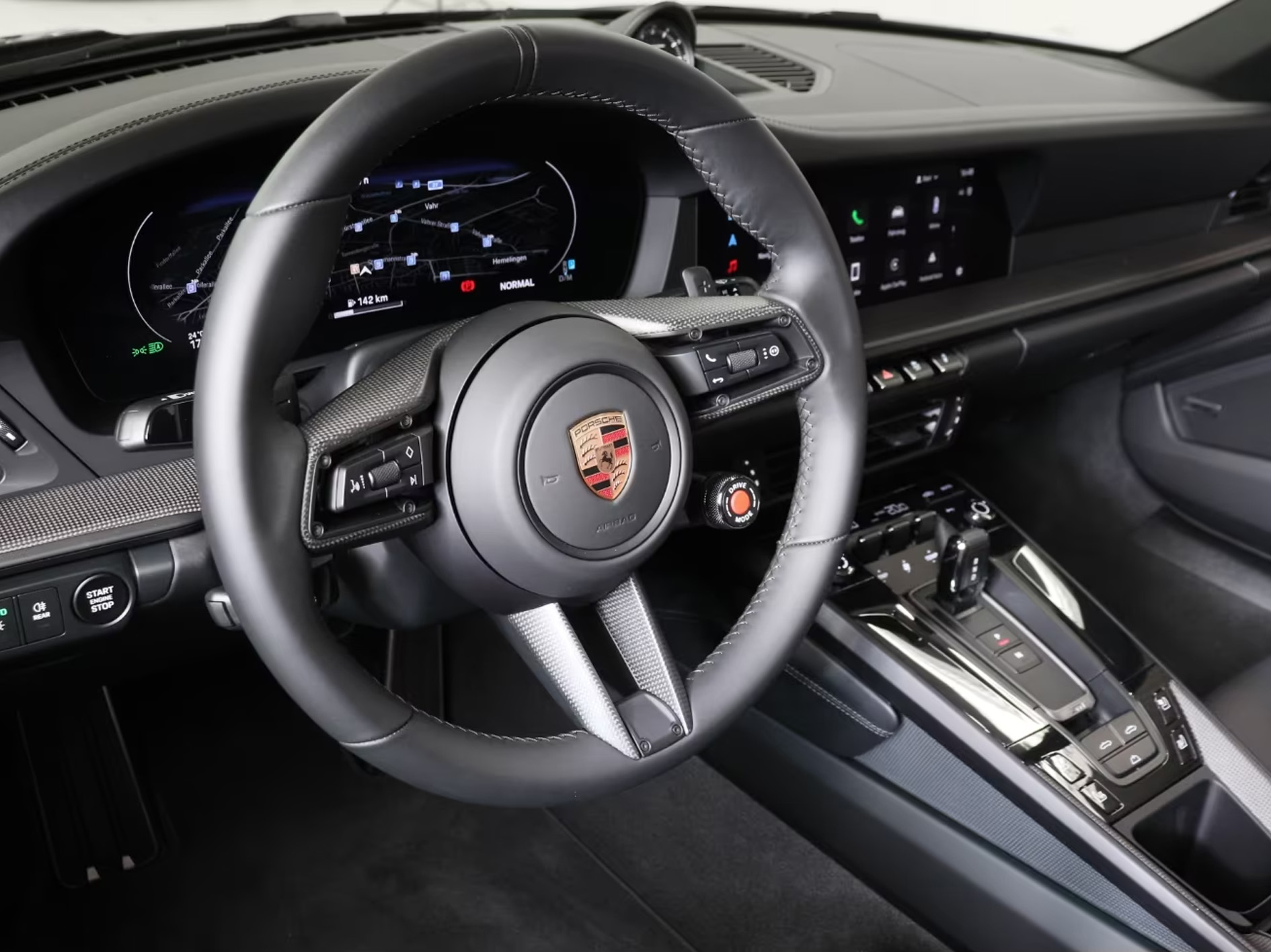 Kabine i luksusmaterialer med sportsrat, digitale instrumenter og Porsche-præcision.